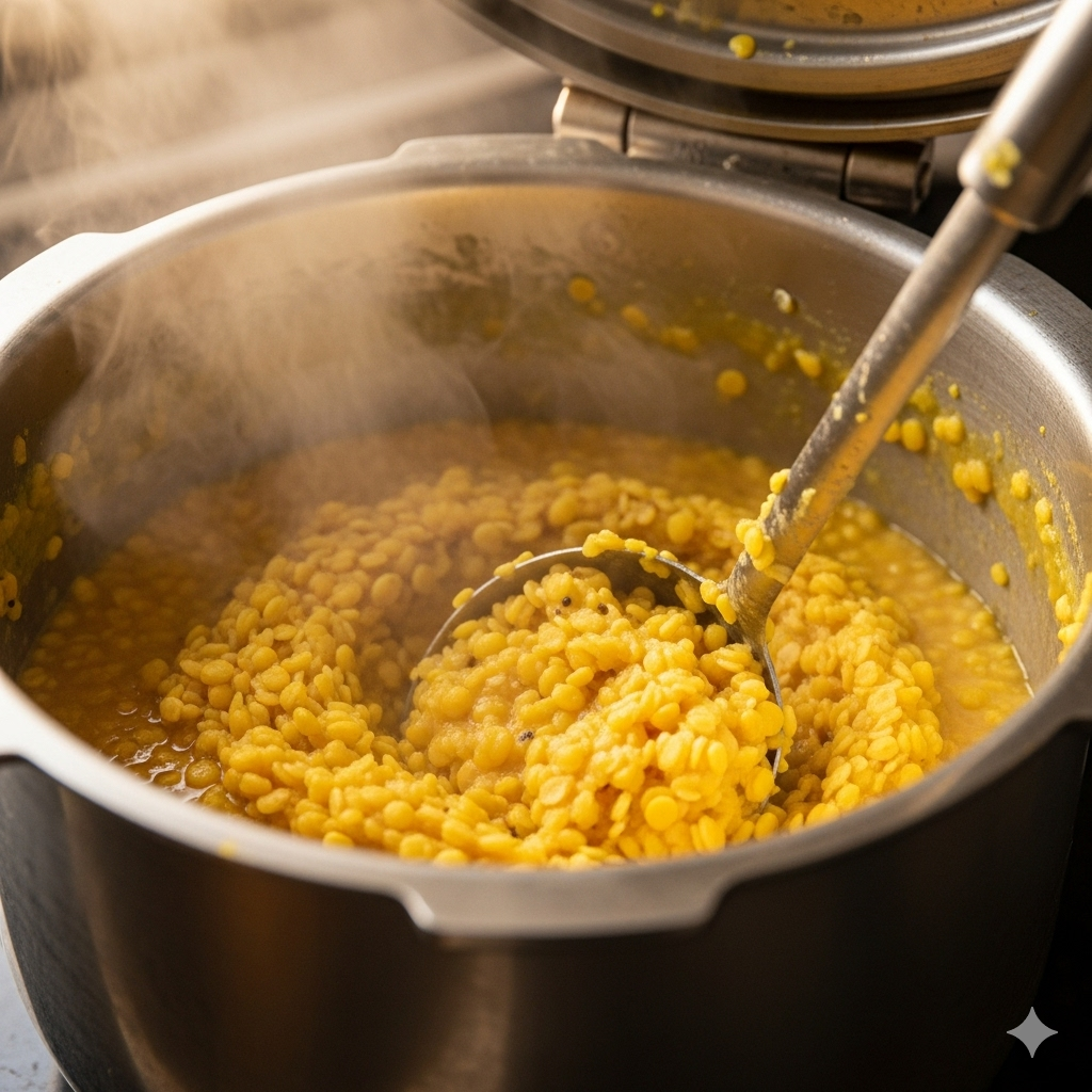 • Rinse toor dal. Pressure-cook with 2½–3 cups water and ½ tsp turmeric until very soft (usually 3–4 whistles) OR cook in a pot until mushy. Mash/whisk to a smooth, slightly creamy consistency and keep aside.