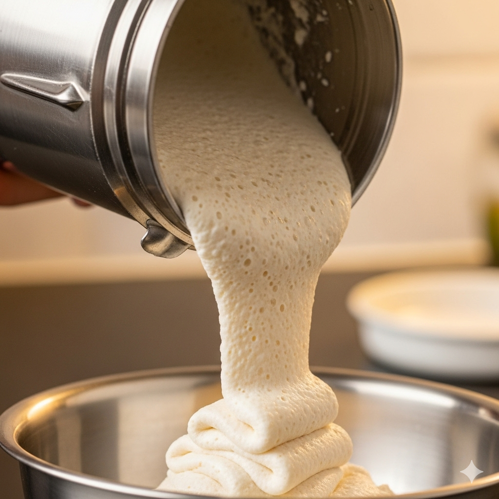 • Combine rice batter + urad paste thoroughly in a large, clean bowl. Mix by hand or spatula (hand warmth helps fermentation). Aim for a batter consistency that’s slightly thicker than pancake batter.